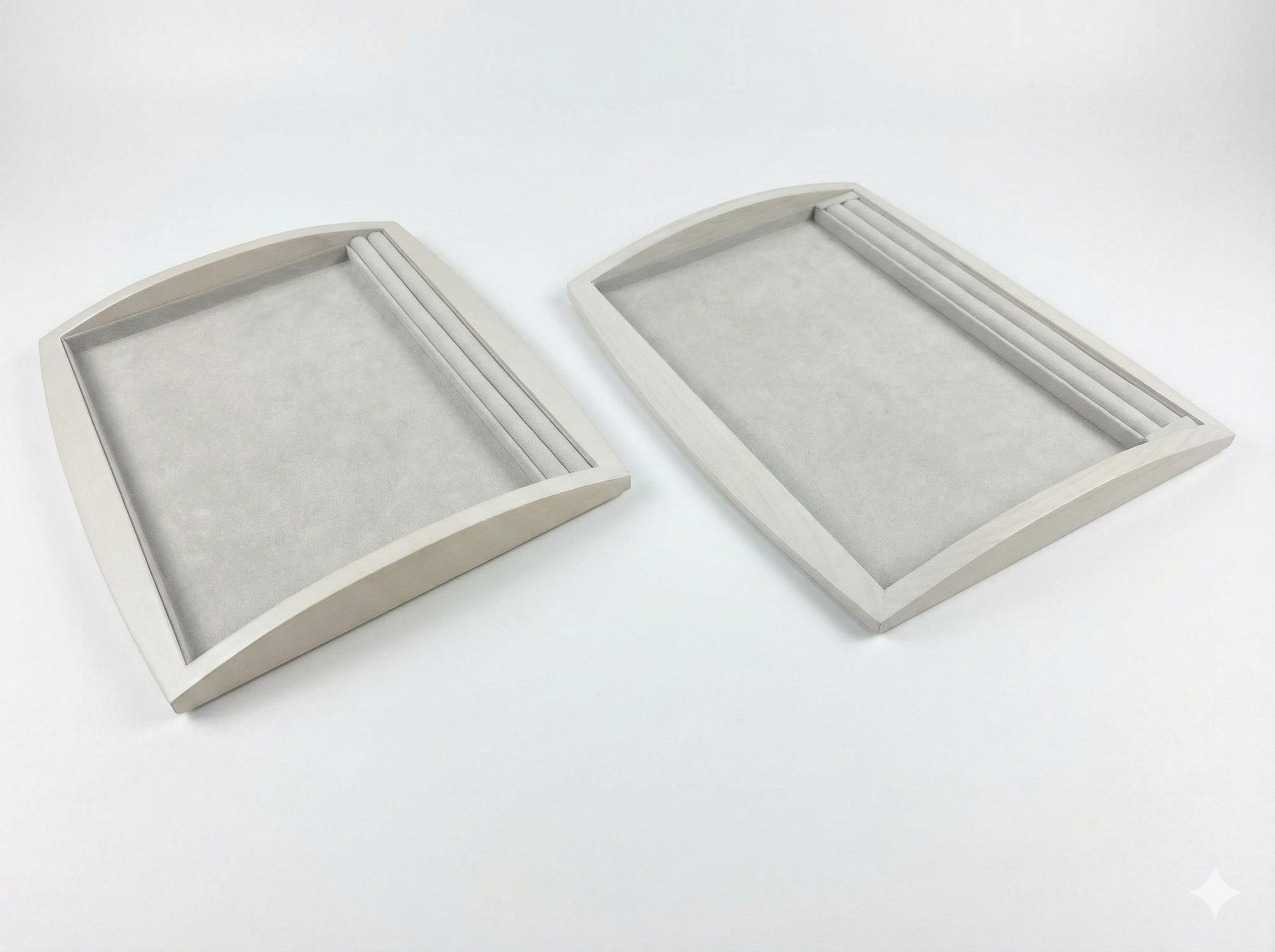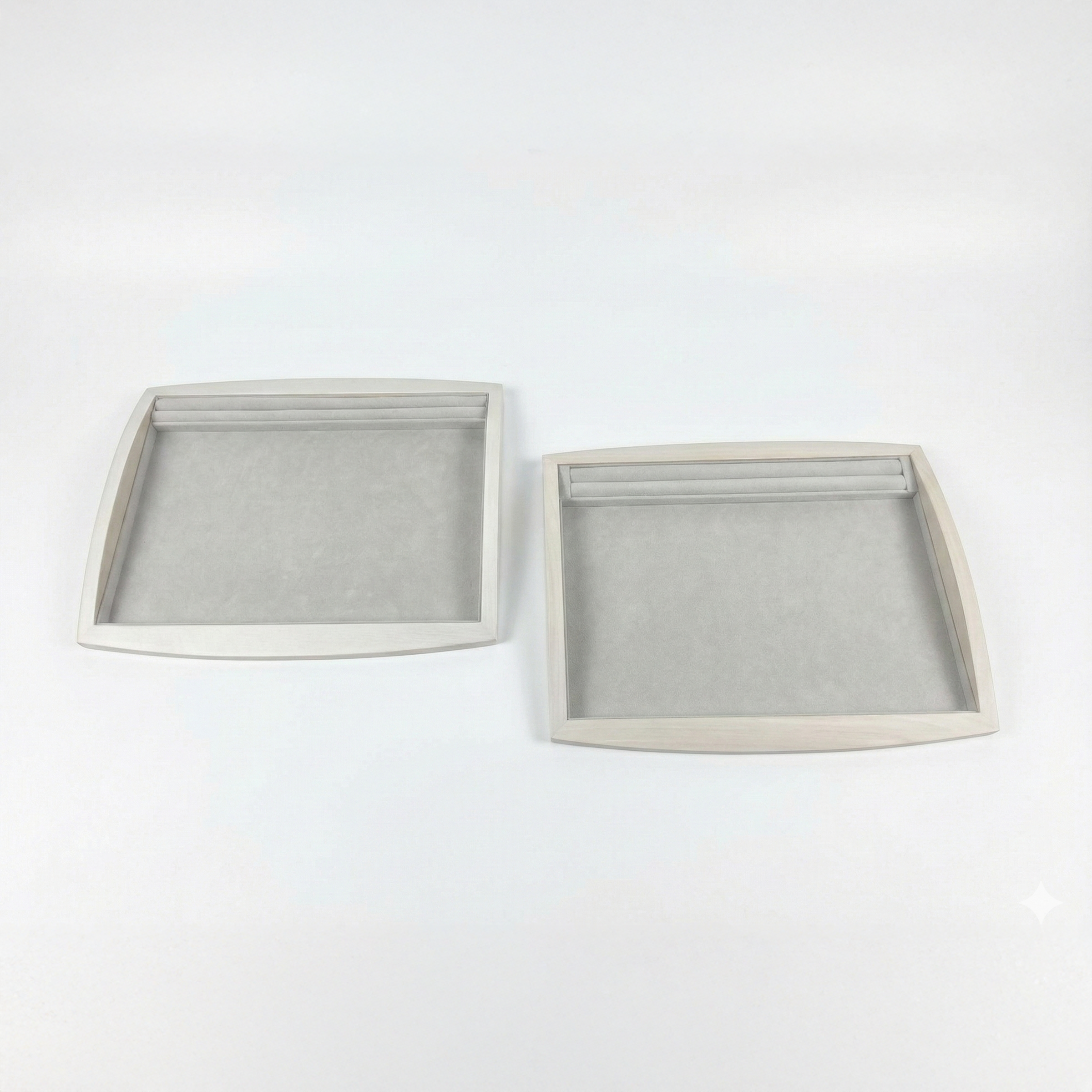 Enhance your jewelry presentation with our VTC/TC 3326 Series Trays. Featuring a unique curved frame silhouette and a dedicated ring roll section, these trays offer a spacious 33×26 cm layout perfect for presenting full jewelry sets. Available in natural wood or premium leatherette finish.