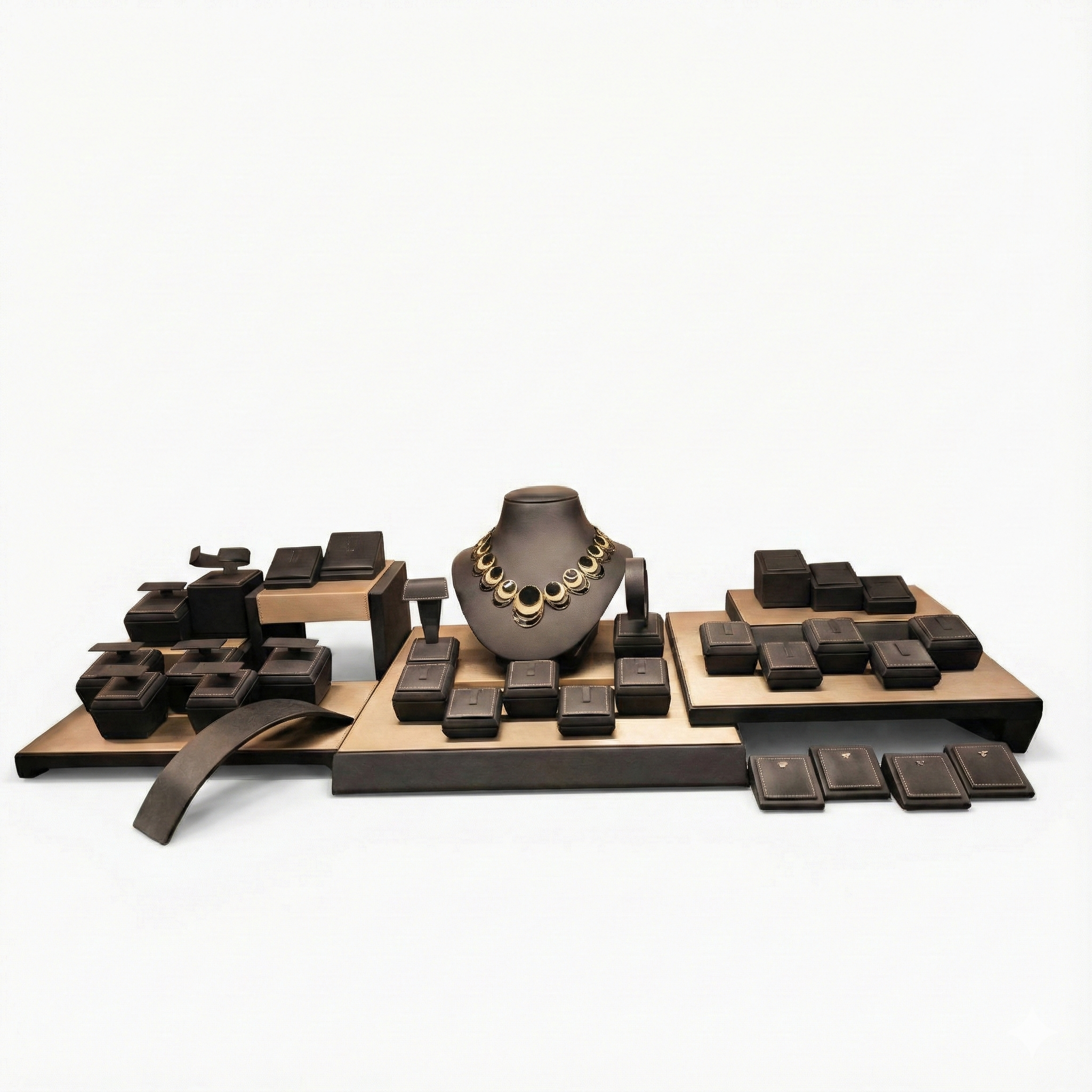 This group includes the functional elements for intricate display, with multiple levels and dedicated shapes for optimal visibility of rings, earrings, and wristwear.